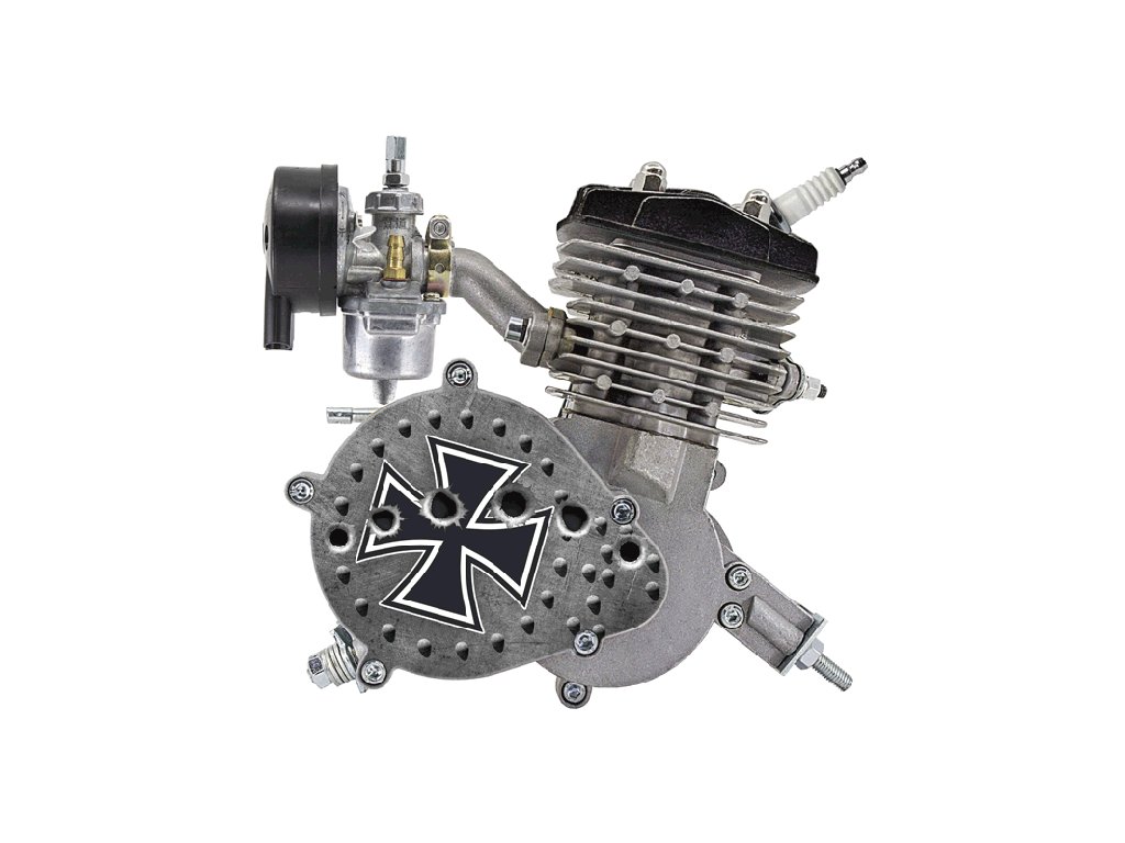 motor s magneto zapalováním a svíčkou, CDI s vysokonapěťovým kabelem a fajfkou svíčky, nádrž s víčkem, rozetu 44z s napínacím mechanismem řetězu, řetěz, kryt řetězu, ocelová lanka s bowdeny (plynové a spojkové), páčku spojky, rukojetě včetně plynové, tlačítko zhášeče motoru s kabely, kompletní výfuk, podrobný český návod montáže + uživatelský manuál. Balení obsahuje kompletní kit,včetně všech drobných komponentů k sestavení.
