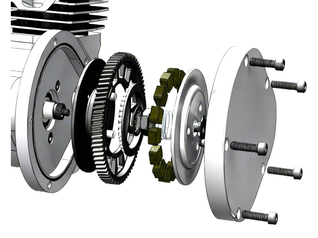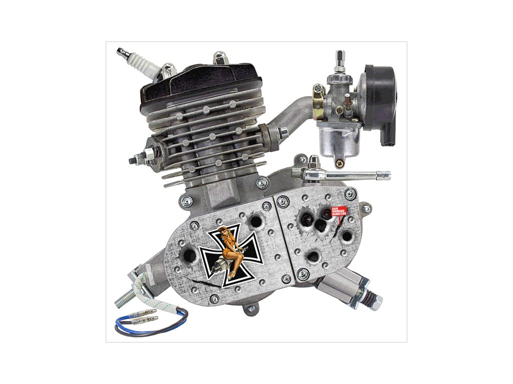 motor s magneto zapalováním a svíčkou, CDI s vysokonapěťovým kabelem a fajfkou svíčky, nádrž s víčkem, rozetu 44z s napínacím mechanismem řetězu, řetěz, kryt řetězu, ocelová lanka s bowdeny (plynové a spojkové), páčku spojky, rukojetě včetně plynové, tlačítko zhášeče motoru s kabely, kompletní výfuk, podrobný český návod montáže + uživatelský manuál. Balení obsahuje kompletní kit,včetně všech drobných komponentů k sestavení.