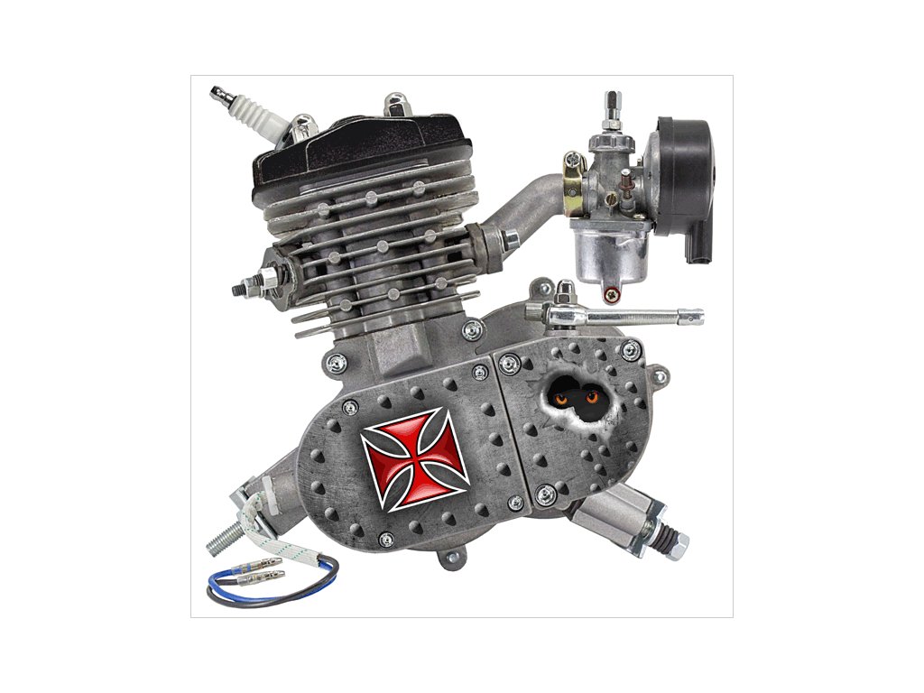 motor s magneto zapalováním a svíčkou, CDI s vysokonapěťovým kabelem a fajfkou svíčky, nádrž s víčkem, rozetu 44z s napínacím mechanismem řetězu, řetěz, kryt řetězu, ocelová lanka s bowdeny (plynové a spojkové), páčku spojky, rukojetě včetně plynové, tlačítko zhášeče motoru s kabely, kompletní výfuk, podrobný český návod montáže + uživatelský manuál. Balení obsahuje kompletní kit,včetně všech drobných komponentů k sestavení.