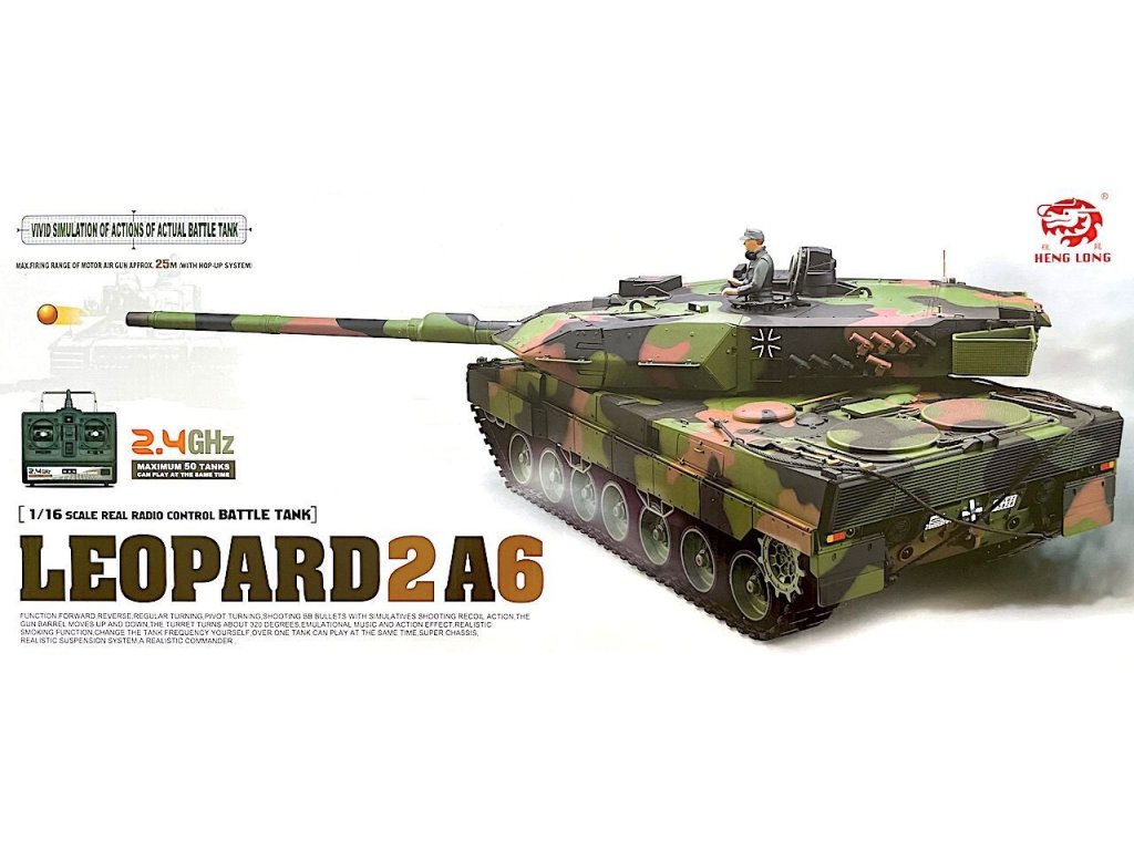 Model tanku Leopard 2A6 v měřítku 1:16 věrně simuluje většinu funkcí skutečného tanku. Je vybaven realistickým super podvozkem s funkčními pásy, hnacími, pojezdovými a napínacími koly, které umožňují všechny jízdní vlastnosti Každé kolo je samostatně odpružené a díky tomu se jízda v terénu stává skutečným zážitkem. A nechybí ryze tanková "vychytávka" - otáčení na místě pomocí protiběžného pohybu pásů.