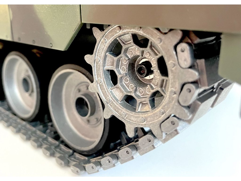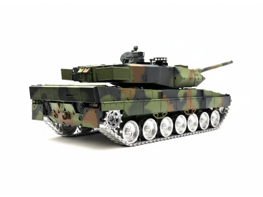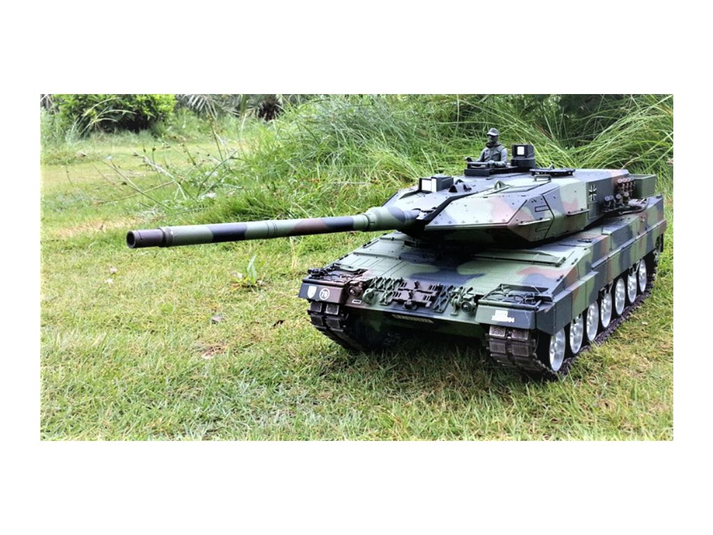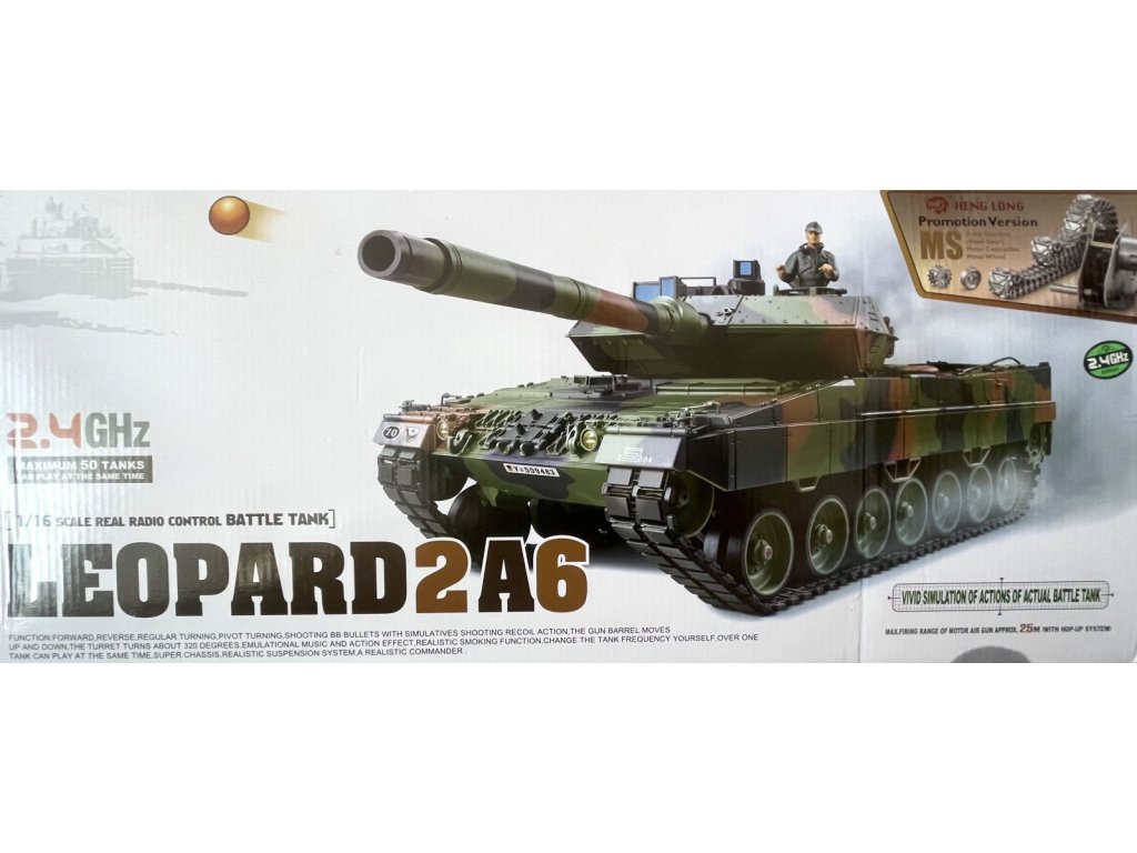 Model tanku German Leopard 2A6 v měřítku 1:16 věrně simuluje většinu funkcí skutečného tanku. Je vybaven realistickým super podvozkem s funkčními pásy, hnacími, pojezdovými a napínacími koly, které umožňují všechny jízdní vlastnosti. Každé kolo je samostatně odpružené a díky tomu se jízda v terénu stává skutečným zážitkem. A nechybí ryze tanková "vychytávka" - otáčení na místě pomocí protiběžného pohybu pásů.