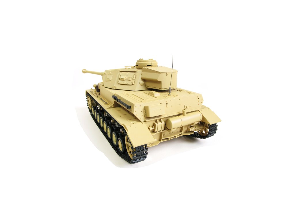 TANK German Panzer IV (F Type) s dosahem ovladače až 50 metrů. Tank operuje na frekvenci 2,4 GHz (může podporovat více současných operací), baterie 7,4 V 1800 mAh lithium (Li-ion), doba nabíjení je cca 4 hodiny, čas jízdy tanku cca 40 minut. Funkce: vpřed, zrychlení vpřed, vzad, zrychlení ústupu, rotace, spuštění BBS a proti nárazu - zákluz hlavně (při výstřelu tank imituje zpětný ráz zákluzem hlavně), zvedání hlavně 30 stupňů, otáčení věže 320 stupňů, simulace zvuku (chod motoru, střelba, skřípání pásů), proporcionální funkce dálkového ovládání (plynule přidává rychlost podle pohybu páček na ovladači), kouřové efekty motoru (dolévací kapalina), super podvozek, realistický systém odpružení, kdy každé kolo je samostatně odpružené a díky tomu se jízda v terénu stává skutečným zážitkem.